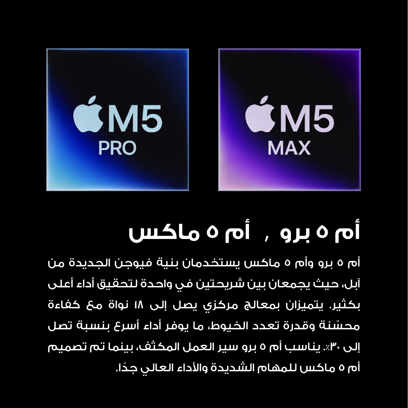 حاسوب آبل ماك بوك برو مقاس 14 بوصة بشريحة آبل M5، وحدة معالجة مركزية 10 نوى ووحدة رسوميات 10 نوى، ذاكرة 16 جيجابايت، قرص SSD سعة 1 تيرابايت – فضي | MDE54AB/A